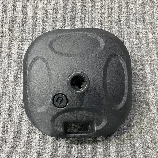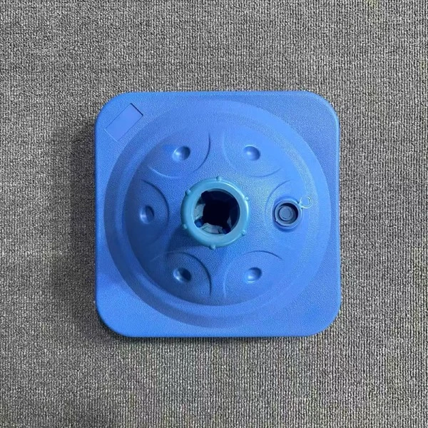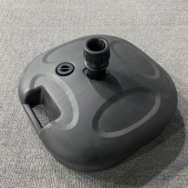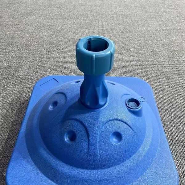 I midten av basen er det en rørhylse (de fleste standard paraplystenger kan tilpasses dette), og det er også et vanninjeksjonshull på siden, som gjør det veldig praktisk å fylle med vann og sand. Når den er helt fylt har den en betydelig vekt, som kan holde paraplyen stabil også i vind. I tillegg er det et dreneringshull. Når du vil brette den sammen eller flytte den til et annet sted, er det veldig enkelt å tømme den.
