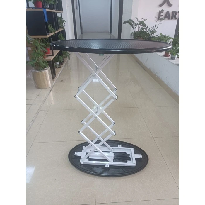 Oral løftbar benkeplate i plast har en elegant rund bordplate i sort plast og en sterk sakseløftemekanisme i hvitt metall, som blander moderne stil med bruk i den virkelige verden. Den svarte plastbasen holder den stødig, mens løftesystemet lar deg justere høyden jevnt. Trenger du en kompakt utstillingskrok eller en hevet serveringsdisk? Dette stykket tilpasser seg lett. Plastoverflaten er superenkel å tørke av, og den sammenleggbare designen fjerner bryet med å lagre og flytte den.