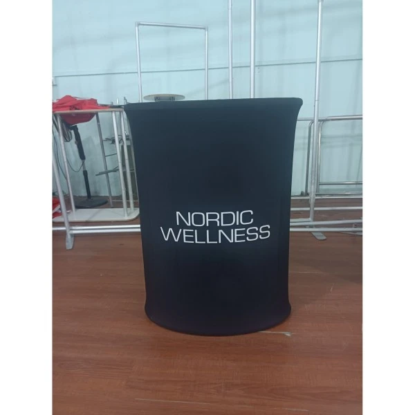 Rund løftbar disk i plast som tilpasser seg dine behov på et øyeblikk. Rammen er laget av førsteklasses plast – solid nok til å tåle daglig bruk, men likevel lett nok til å bevege seg uten belastning. Dekselet i stretchstoff? Det er merkevarens tomme lerret. Slå på logoen din, merkefargene eller et hvilket som helst design du drømmer om, og se identiteten din dukke opp. Høyden er fullt justerbar, så enten du chatter med en potensiell kunde eller viser frem et nytt produkt, kan du sette det til det perfekte nivået.
